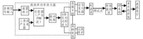 如圖1所示為系統(tǒng)的整體實(shí)現(xiàn)框圖,系統(tǒng)由高效率功率放大、信號(hào)變換電路、過(guò)流保護(hù)及功率測(cè)量4個(gè)主要模塊組成。其中最核心的高效率功率放大器又由前置放大、三角波產(chǎn)生電路、比較器電路、驅(qū)動(dòng)電路、H橋互補(bǔ)對(duì)稱放大5部分構(gòu)成。輸入音頻信號(hào)經(jīng)過(guò)前置放大電路進(jìn)行放大調(diào)理后,分上下部與兩路三角波信號(hào)進(jìn)行比較,得到兩路相互對(duì)應(yīng)的PWM波;即對(duì)音頻信號(hào)進(jìn)行脈寬調(diào)制,而后經(jīng)驅(qū)動(dòng)電路增加其信號(hào)的驅(qū)動(dòng)能力,再給入H橋模塊,利用占空比的變化控制功率開(kāi)關(guān)管的導(dǎo)通與截止,實(shí)現(xiàn)功率放大,之后再對(duì)負(fù)載上的輸出進(jìn)行低通濾波濾出原音頻信號(hào)。在負(fù)載上將信號(hào)給入信號(hào)變化電路,將雙端信號(hào)轉(zhuǎn)化為單端信號(hào),經(jīng)一截止頻率為20 kHz的RC濾波器后接測(cè)試儀表測(cè)試。同時(shí)在此處將單端信號(hào)真有效值檢波,經(jīng)AD采樣后送入單片機(jī)內(nèi)進(jìn)行功率計(jì)算及顯示。系統(tǒng)還有過(guò)流保護(hù)功能,0.1Ω采樣電阻與負(fù)載串聯(lián),采出流過(guò)負(fù)載的電流值,經(jīng)放大比較后,用繼電器控制功率放大部分的供電,從而實(shí)現(xiàn)保護(hù)作用。系統(tǒng)最大不失真輸出功率大于等于1 W,可實(shí)現(xiàn)電壓放大倍數(shù)1~20連續(xù)可調(diào),因采用D類放大方案,可達(dá)到較高的效率,輸出噪聲很小,功率顯示誤差很小。