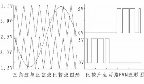 雙路比較器電路采用低功耗、可單電源工作的雙路比較器芯片LM393構(gòu)成。此處為提高系統(tǒng)效率,減少后級(jí)H橋中CMOS管不必要的開(kāi)合,用兩路偏置不同的三角波分別與音頻信號(hào)的上半部和下半部進(jìn)行比較,產(chǎn)生兩路相互對(duì)應(yīng)的PWM波信號(hào)給后級(jí)驅(qū)動(dòng)電路進(jìn)行處理,雙路比較波形圖如圖3所示。此處值得注意的是將上半部比較處理為音頻信號(hào)接比較器的負(fù)向端、三角波信號(hào)接正向端;下半部比較則相反,這樣形成相互對(duì)應(yīng),在音頻信號(hào)的半部形成相應(yīng)PWM波時(shí),另半部為低電平,可保征后級(jí)H橋中的CMOS管沒(méi)有不必要的開(kāi)合,以減少系統(tǒng)功率損耗。利用電位器將上半部比較三角波偏置調(diào)至3 V,下半部比較三角波偏置調(diào)至2 V.還需注意,三角波信號(hào)應(yīng)比需比較范圍內(nèi)的音頻信號(hào)幅度稍大一些,且偏置調(diào)節(jié)要較準(zhǔn)確,以防音頻信號(hào)某些點(diǎn)比較不到,后續(xù)濾波還原原信號(hào)時(shí)產(chǎn)生失真。