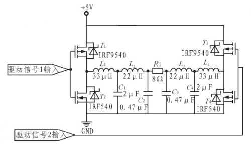 H橋互補(bǔ)對(duì)稱電路如圖4.采用低導(dǎo)通電阻、開(kāi)關(guān)速率快、受溫度影響小的場(chǎng)效應(yīng)對(duì)管IRF9540和IRF540組成互補(bǔ)推挽放大電路。運(yùn)用對(duì)稱輸出方式,充分利用電源電壓,浮動(dòng)輸出載波峰峰值量大可達(dá)10 V,有效地提高了輸出功率。