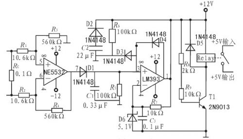 經(jīng)過(guò)放大后的信號(hào)經(jīng)過(guò)由D1、C1、R5組成的峰值檢波部分,檢出信號(hào)幅度值送至比較器與設(shè)定的基準(zhǔn)電壓進(jìn)行比較。比較器選用低功耗、響應(yīng)速度較快的雙路比較芯片LM393.比較器負(fù)端用穩(wěn)壓管D6及C3、R7設(shè)置為5.1V,比較器接成遲滯比較方式,一旦過(guò)流,即可自鎖。此時(shí)比較器輸出的高電平使三極管T1導(dǎo)通,繼電器的地控制端與地聯(lián)通,繼電器吸合,切斷功放部分的供電,達(dá)到保護(hù)目的。因比較器自鎖,所以在解決過(guò)流問(wèn)題后,關(guān)斷保護(hù)模塊的電源,才能重新進(jìn)入保護(hù)狀態(tài)。D2、D3、R6、C2組成開(kāi)機(jī)延時(shí)電路,在斷電后,C2通過(guò)D2快速放電,防止開(kāi)始瞬間C2上的殘余電壓對(duì)3號(hào)腳影響,防止比較器在非正常狀態(tài)下進(jìn)入自鎖狀態(tài),使保護(hù)模塊不能發(fā)揮正常作用。