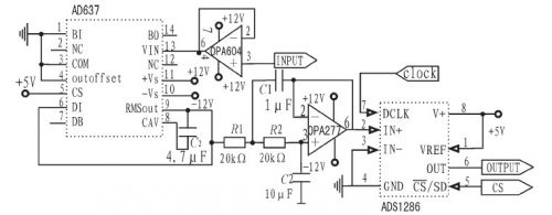 輸入綴用OPA604構(gòu)成一射極跟隨器已達(dá)到隔離前后級(jí)的作用。改變平均電容的值可設(shè)定平均時(shí)間常數(shù),并決定低頻準(zhǔn)確度、輸出波紋的大小和穩(wěn)定時(shí)間。交流波紋分量可以用增大此電容的值來(lái)減少,但這樣會(huì)使建立時(shí)間增大,所以選擇用后接一個(gè)二階有源低通濾波器的方法來(lái)減少輸出的紋波。得出真有效值后直接給入ADS1286進(jìn)行模數(shù)轉(zhuǎn)換,再由FPGA處理,計(jì)算出系統(tǒng)的輸出功率并進(jìn)行顯示。
