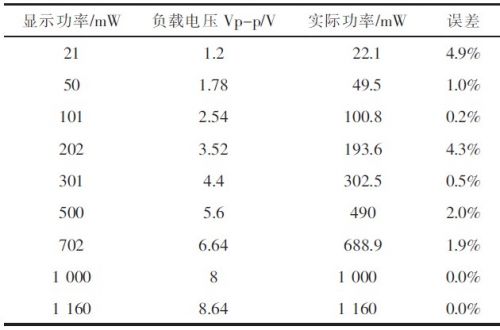 1)功率顯示誤差測(cè)量用Agilent信號(hào)源給出輸入音頻信號(hào),示波器在單端輸出測(cè)試點(diǎn)測(cè)負(fù)載上電壓峰值Vo,據(jù)式計(jì)算出實(shí)際功率,進(jìn)而計(jì)算出顯示誤差,結(jié)果見(jiàn)表1所示。