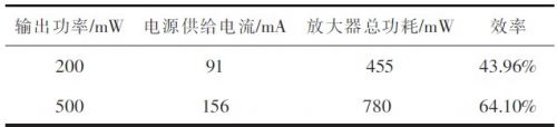 3)效率測(cè)量 用直流電源對(duì)功放電路單獨(dú)供電,以便測(cè)試效率。供電電壓+5 V.用與測(cè)通頻帶相同的方法給出給出輸入信號(hào),用示波器觀察輸出信號(hào)幅值,調(diào)整輸出為200 mW及500 mW,將四位半數(shù)字多用表串入放大器電路中,測(cè)出電路電流I.根據(jù)式計(jì)算出功率放大器效率,結(jié)果見(jiàn)表2所示。