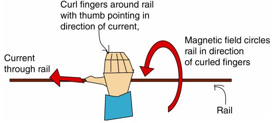 根據(jù)Maxwell方程式,移動(dòng)走線中的電荷可以產(chǎn)生一電流,此電流又會(huì)產(chǎn)生一磁場(chǎng),這種被移動(dòng)電荷產(chǎn)生的磁場(chǎng)稱作「磁通線(magnetic lines of flux)」。使用「右手法則(Right-Hand Rule)」可以輕易地指出磁通線的方向,如附圖四所示。右手拇指代表走線電流流動(dòng)的方向,其余卷曲的手指包圍著走線,代表磁場(chǎng)或磁通線的方向。此外,時(shí)變磁場(chǎng)會(huì)產(chǎn)生一個(gè)垂直的電場(chǎng)。射頻輻射是此磁場(chǎng)和電場(chǎng)的組合。藉由輻射或?qū)щ姷姆绞?,磁?chǎng)和電場(chǎng)會(huì)離開(kāi)PCB結(jié)構(gòu)。
