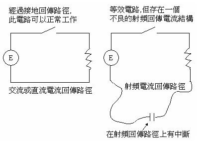 如附圖六所示,一個(gè)開(kāi)關(guān)和來(lái)源驅(qū)動(dòng)端(E)串聯(lián)。當(dāng)開(kāi)關(guān)關(guān)閉時(shí),電路按照期望結(jié)果正常工作;當(dāng)開(kāi)關(guān)開(kāi)啟時(shí),則不具任何功能。對(duì)時(shí)域而言,期望訊號(hào)從來(lái)源端到達(dá)負(fù)載。此訊號(hào)必須具有一個(gè)回傳路徑,才能使此電路成立,這通常是經(jīng)過(guò)一個(gè)0V(接地)的回傳結(jié)構(gòu)(Kirchhoff定律)。射頻電流的流動(dòng)是從來(lái)源端到達(dá)負(fù)載,而且必須經(jīng)過(guò)阻抗盡可能最小的路徑返回,通常它是經(jīng)過(guò)一個(gè)接地走線或接地平面(鏡射平面)。射頻電流的存在,最好使用Ampere定律來(lái)說(shuō)明。