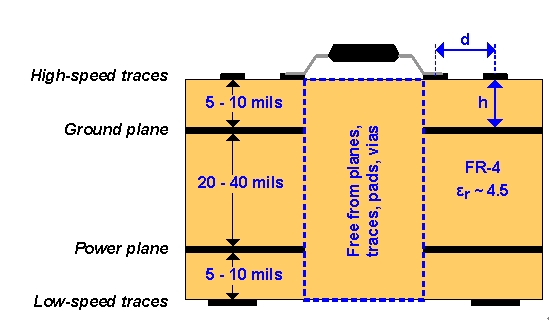 將電源層置于接地層下面。這兩個參考層構(gòu)成了一個大約為100pF/in2的附加高頻旁路電容器。