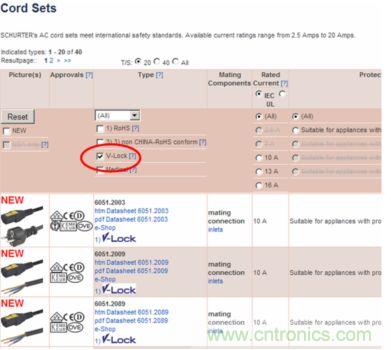 在網(wǎng)頁選型工具“cord sets”(電源線)中,選擇V-Lock標簽及諸如連接器類型、國家插頭或其它特性等選擇標簽,即可輕松選擇。