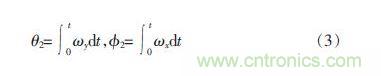 若使用陀螺儀來測(cè)量平衡車姿態(tài)角度,設(shè)陀螺儀測(cè)量載體相對(duì)慣性坐標(biāo)系的x、y、z 三軸旋轉(zhuǎn)角速度分別為ωx、ωy、 ωz。并定義0 時(shí)刻平衡車直立靜止??傻玫礁┭鼋?theta;2和橫滾角φ2估計(jì)值與ωx、ωy之間的關(guān)系如式3 所示: