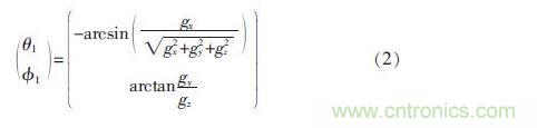 其中,Cbn為慣性坐標(biāo)系到載體坐標(biāo)系的變換矩陣;θ 為俯仰角;φ為橫滾角;g 為重力加速度; 可以通過測(cè)量重力加速度分量gx、gy、gz,計(jì)算出平衡車俯仰角θ1和橫滾角φ1估計(jì)值