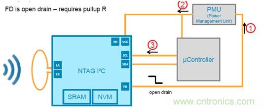 為了省電,整個系統(tǒng)可以通過FD 引腳檢測到有外部場強時喚醒主控,F(xiàn)D腳拉低喚醒: