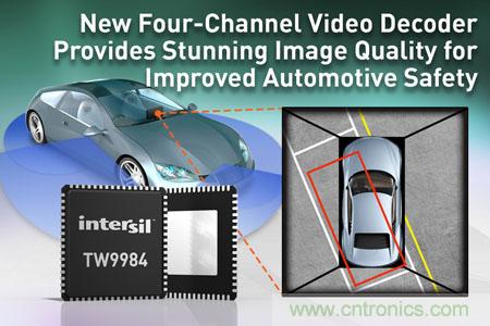 【導(dǎo)讀】近日,Intersil公司宣布,推出用于汽車(chē)環(huán)景泊車(chē)輔助應(yīng)用的新型四通道模擬視頻解碼器TW9984,該解碼器內(nèi)置有模擬視頻編碼器,可幫助提高駕駛員以及行人的安全性。