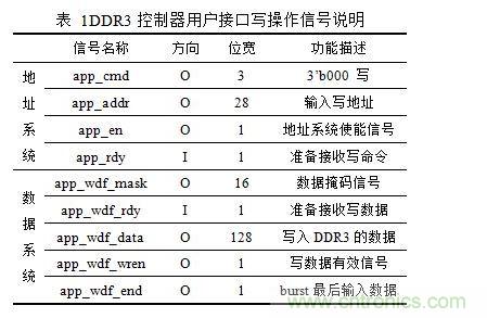 DDR3存儲(chǔ)器控制模塊用戶接口寫操作有兩套系統(tǒng),一套是地址系統(tǒng),一套是數(shù)據(jù)系統(tǒng)。用戶接口寫操作信號(hào)說(shuō)明如表 1所示。