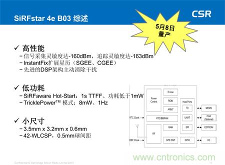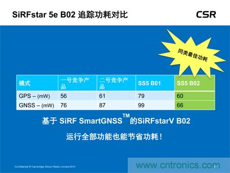 可穿戴設(shè)備應(yīng)用。該低功耗器件現(xiàn)已全面投入生產(chǎn),不僅可大幅度降低功耗且不影響定位精度,還可提供多衛(wèi)星GNSS支持,可滿足所有地區(qū)對GNSS的需求,包括美國的GPS、歐洲的伽利略、俄國的Glonass及中國的北斗衛(wèi)星系統(tǒng)。此外,SiRFstar 5e B02還搭載了CSR全新的SmartGNSS技術(shù),可提供兩種模式最大程度地降低功耗,并能夠根據(jù)信號條件及衛(wèi)星可用性自主管理GNSS系統(tǒng)的應(yīng)用。