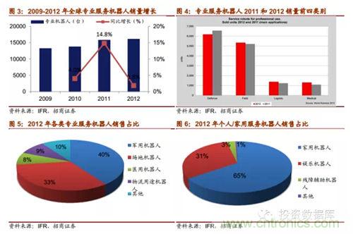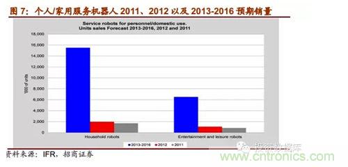 IFR報(bào)告預(yù)期,從2013年到2016年,全球工業(yè)機(jī)器人市場(chǎng)將以年均6%的速度增長(zhǎng),中國(guó)是這一增長(zhǎng)趨勢(shì)的領(lǐng)跑者,年均增長(zhǎng)率達(dá)15%。根據(jù)marketsandmarkets的報(bào)告,2011年全球服務(wù)機(jī)器人市場(chǎng)規(guī)模為183.9億美元,到2012年增長(zhǎng)到207.3億美元,計(jì)2012-2017年全球服務(wù)機(jī)器人市場(chǎng)規(guī)模復(fù)合增速將達(dá)到17.4%,到2017年達(dá)到461.8億美元。對(duì)于專(zhuān)業(yè)服務(wù)機(jī)器,IFR預(yù)測(cè)2013-2016年估計(jì)有94800臺(tái)專(zhuān)業(yè)服務(wù)機(jī)器人會(huì)得到安裝使用,銷(xiāo)售額達(dá)171億美元。其中軍用機(jī)器人銷(xiāo)量約達(dá)28000臺(tái);場(chǎng)地機(jī)器人中的擠奶機(jī)器人銷(xiāo)量估計(jì)為24500臺(tái)。兩者占總專(zhuān)業(yè)服務(wù)機(jī)器人銷(xiāo)量55%。