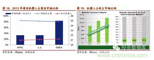 iRobot在家居清潔機(jī)器人市場(chǎng)上處于領(lǐng)先地位。2011年至2013年總清潔機(jī)器設(shè)備消費(fèi)增長(zhǎng)迅速,13年大于12億美元,而iRobot占市場(chǎng)的利率也逐年上漲,2013年達(dá)18.1%。iRobot在家居機(jī)器人行業(yè)中屬于龍頭領(lǐng)先企業(yè)并已經(jīng)打通了全球銷(xiāo)售的網(wǎng)絡(luò),在各大市場(chǎng)iRobot都遠(yuǎn)遠(yuǎn)領(lǐng)先于其它企業(yè)。2013年iRobot掃地機(jī)器人占北美市場(chǎng)比例為83%,占?xì)W洲、中東及非洲市場(chǎng)(EMEA)62%,占環(huán)太平洋與日本市場(chǎng)(APAC)67%。2014年剛公布的半年報(bào)中,iRobot預(yù)計(jì)家用機(jī)器人全年銷(xiāo)售額同比增幅為18%-20%。