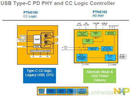 不同的應用場景,不同的復雜度層次,NXP有不同的產(chǎn)品和方案來搭配,為設計者提供達到系統(tǒng)最佳化的方案。下圖中展示了NXP的CC邏輯控制和PD PHY方案。吳韶阡介紹說,如果是低于15W的供電,或者是不需要支持多功能的設計,可以采用簡單的CC邏輯控制;而一個完整的USB Type-C方案就需要使用完整的PD方案,相應的元器件也會增加。