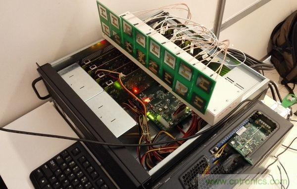 筆者有幸成為挑戰(zhàn)這一科技難題的一員,參與搭建了Open Air Interface 64天線模型機(jī)。下圖是其微縮版本(微縮為16根天線),旨在展示我們對相關(guān)技術(shù)瓶頸的解決方案,在上個月的歐洲網(wǎng)絡(luò)與通信研究大會上收到了良好反響。