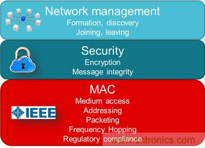 IEEE 802.15.4標(biāo)準(zhǔn)被用作目前市面上很多常見網(wǎng)絡(luò)互連標(biāo)準(zhǔn)的數(shù)據(jù)鏈路層,例如6LoWPAN、Wi-SUN、ZigBee®、Thread和WHART等。由于諸如空中調(diào)停(通過CSMA-CA實(shí)現(xiàn))、接受、重傳以及內(nèi)置AES安全性等特性,其保障了無線基礎(chǔ)的穩(wěn)定。