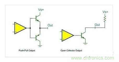 關(guān)于推挽輸出和開漏輸出,最后用一幅最簡單的圖形來概括:該圖中左邊的便是推挽輸出模式,其中比較器輸出高電平時(shí)下面的PNP三極管截止,而上面NPN三極管導(dǎo)通,輸出電平VS+;當(dāng)比較器輸出低電平時(shí)則恰恰相反,PNP三極管導(dǎo)通,輸出和地相連,為低電平。右邊的則可以理解為開漏輸出形式,需要接上拉。