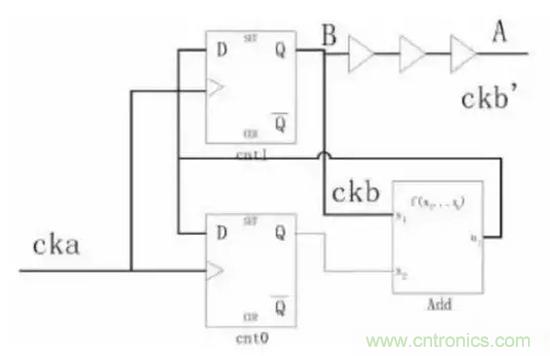 為了方便討論,時(shí)鐘樹(shù)插入以后,假設(shè)A與B之間有1個(gè)ckaCycle的skew;從圖3可以看到如果采用A點(diǎn)作加法器的輸入時(shí)產(chǎn)生的波形是ckb’,采用B點(diǎn)作為輸入時(shí)的波形是ckb,顯然,從例1的代碼來(lái)看,ckb才是正確的。因此必須注意到,如果時(shí)鐘當(dāng)作普通的信號(hào)使用時(shí)可能帶來(lái)的問(wèn)題,這類問(wèn)題并沒(méi)有一個(gè)通用的解決辦法。在這個(gè)例子中,不采用時(shí)鐘樹(shù)上的信號(hào)才是正確的,但是在另外一些應(yīng)用中,就必須采用時(shí)鐘樹(shù)上的信號(hào)。比如,時(shí)鐘是CK的兩個(gè)觸發(fā)器中鎖存的數(shù)據(jù)再由CK的高電平和低電平選擇輸出,那么,這個(gè)時(shí)候就需要作為選擇信號(hào)的CK從時(shí)鐘樹(shù)上拉過(guò)來(lái)。因此,如果設(shè)計(jì)中用到了時(shí)鐘信號(hào)作為普通信號(hào)的情況,在后端設(shè)計(jì)時(shí)就必須特殊處理。