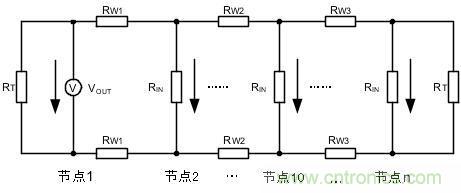 圖 4中,各節(jié)點(diǎn)的RW、RIN難以準(zhǔn)確確定,組網(wǎng)時(shí)以公式計(jì)算較為繁瑣,簡(jiǎn)便的方法便是測(cè)量總線兩端的節(jié)點(diǎn)電壓。如網(wǎng)絡(luò)的總線電阻過(guò)大時(shí),節(jié)點(diǎn)1到節(jié)點(diǎn)n總線對(duì)信號(hào)的損耗會(huì)很大,當(dāng)節(jié)點(diǎn)n接收的差分電壓低于1.2V時(shí),需要增大終端電阻。