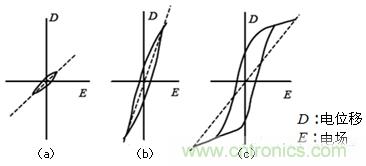 如上所述,鐵電體陶瓷的結(jié)晶粒(Grain)有分域(Domain),各個自發(fā)極化(Ps)的方向是隨機的,整體上相當于無極化的狀態(tài)。在此之上施加電場(E)時,電場方向上產(chǎn)生極化,達到飽和值。在這種狀態(tài)下即使去除電場,極化方向也不會回到原來無序隨機的狀態(tài),多少會停留在極化時的狀態(tài)上,形成殘留極化,在外部顯現(xiàn)。為了讓這種殘留極化歸零,需要反方向的電場。逆電場進一步增強時會發(fā)生極化反轉(zhuǎn),向相反方向進行極化。類似這樣的因外部電場而引起的鐵電體的極化動作如圖4的D-E歷史曲線(磁滯曲線)。