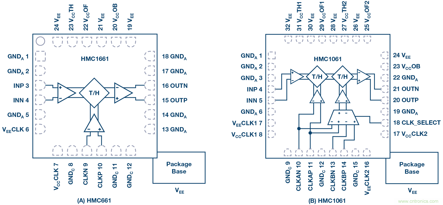以單級THA HMC661為例,產(chǎn)生的輸出由兩段組成。在輸出波形(正差分時鐘電壓)的采樣模式間隔中,器件成為一個單位增益放大器,在輸入帶寬和輸出放大器帶寬的約束下,它將輸入信號復(fù)制到輸出級。在正時鐘到負時鐘躍遷時,器件以非常窄的采樣時間孔徑對輸入信號采樣,并且在負時鐘間隔內(nèi),將輸出保持在一個相對恒定的代表采樣時刻信號的值。配合ADC進行前端采樣時,常常優(yōu)先使用單級器件(ADI 同時法布里了兩級THA 的型號HMC1061),原因是多數(shù)高速ADC已經(jīng)在內(nèi)部集成一個THA,其帶寬通常要小得多。因此,在ADC之前增加一個THA便構(gòu)成一個復(fù)合雙級組件(或一個三級組件,如果使用的是雙級HMC1061),THA在轉(zhuǎn)換器前面。采用同等技術(shù)和設(shè)計時,單級器件的線性度和噪聲性能通常優(yōu)于雙級器件,原因是單級器件的級數(shù)更少。所以,單級器件常常是配合高速ADC進行前端采樣的最佳選擇。