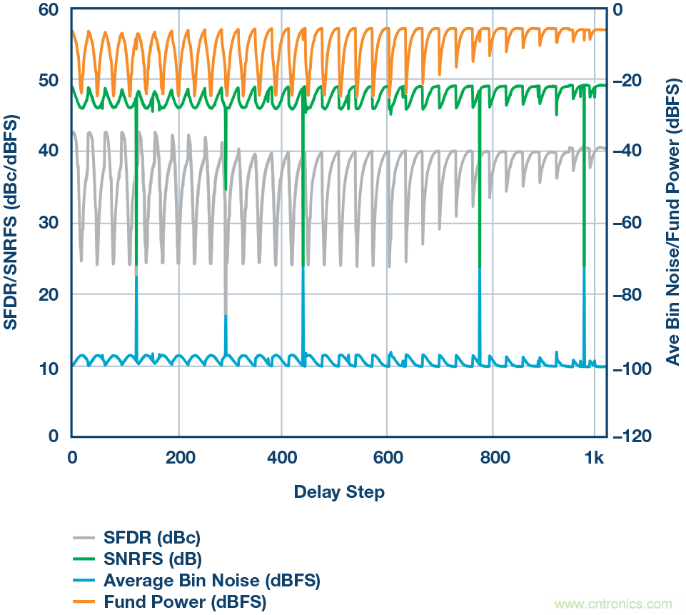 為了獲得最佳延遲設(shè)置,將一個信號施加于THA和ADC組合,該信號應(yīng)在ADC帶寬范圍之外。本例中,我們選擇一個約10 GHz的信號,并施加-6 dBFS的電平(在FFT顯示屏上捕獲)。延遲設(shè)置現(xiàn)在以二 進制步進方式掃描,信號的電平和頻率保持恒定。在掃描過程中顯示并捕獲FFT,收集每個延遲設(shè)置對應(yīng)的基波功率和無雜散動態(tài)范圍 (SFDR) 數(shù)值。