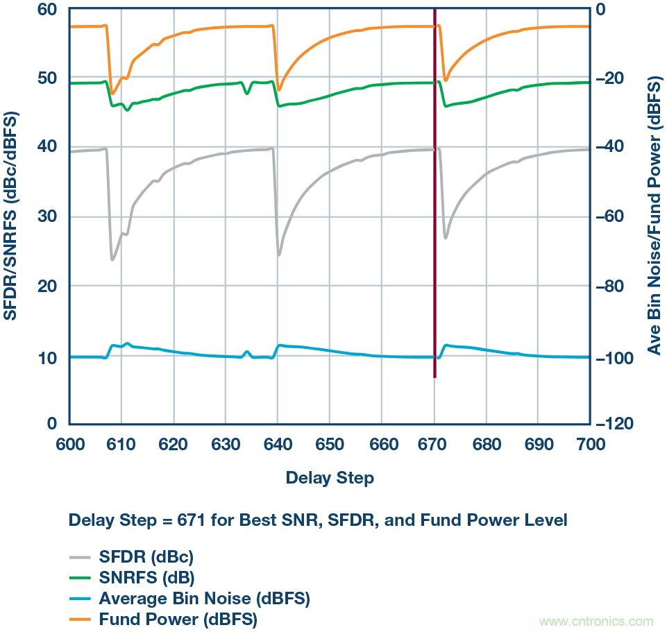 結(jié)果如圖3a所示,基波功率、SFDR和SNR將隨所應(yīng)用的每個設(shè)置而變化。如圖所示,當(dāng)把采樣位置放在更好的地方(THA將樣本送至ADC的過程之中)時,基波功率將處于最高水平,而SFDR應(yīng)處于最佳性能(即最低)。圖3b為延遲映射掃描的放大視圖,延遲設(shè)定點為671,即延遲應(yīng)該保持固定于此窗口/位置。請記住,延遲映射程序僅對系統(tǒng)的相關(guān)采樣頻率有效,如果設(shè)計需要不同的采樣時鐘,則需要重新掃描。本例中,采樣頻率為4 GHz,這是該信號鏈中使用的THA器件的最高采樣頻率。