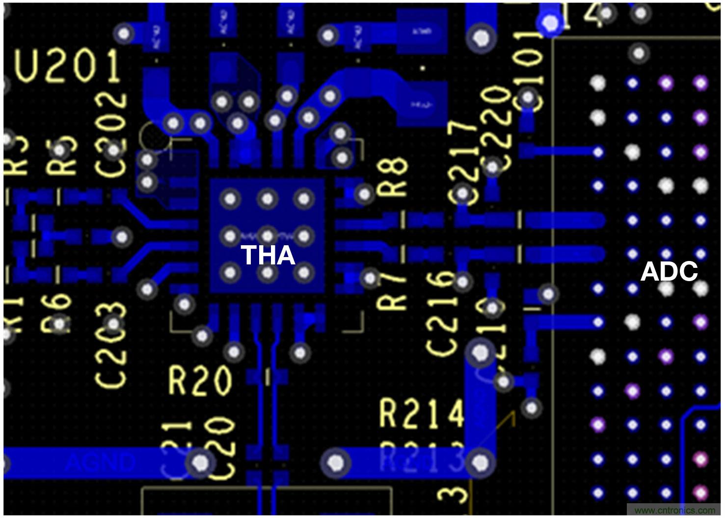 信號通過差分模式連接到THA輸入(我們同時是也提供單端射頻信號輸入的參考設(shè)計鏈路),形成單一前端網(wǎng)絡(luò)。為了最大限度地減少過孔數(shù)量和總長度,我們在這里特別小心,讓過孔不經(jīng)過這兩條模擬輸入路徑,并且?guī)椭窒呔€連接中的任何線腳。