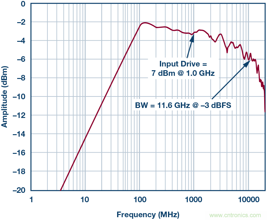 圖7顯示了通帶平坦度,證明在RF ADC之前增加一個THA可以實現(xiàn) 10 GHz的帶寬,從而充分擴展AD9689的模擬帶寬。
