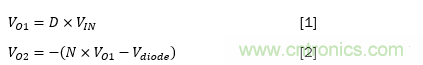 其中VIN是輸入電壓,VO1和VO2分別是主和次級輸出,D是占空比,N是變壓器匝數(shù)比,是二極管的正向壓降。
