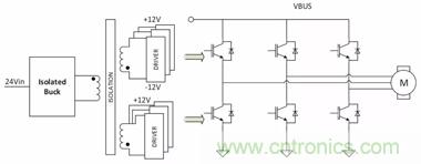 隔離式柵極驅動器一般用于大功率逆變器應用,包括UPS系統(tǒng)、電機控制、高密度放電(HID)燈鎮(zhèn)流器和感應加熱。其他應用包括AC和DC變速驅動、工業(yè)/太陽能逆變器和伺服驅動。圖13顯示了使用隔離式降壓轉換器的具有IGBT柵極驅動偏置的3相逆變器。