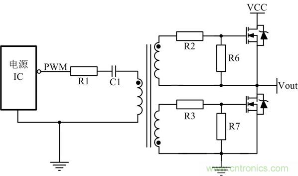 為了滿足如圖5所示高端MOS管的驅(qū)動(dòng),經(jīng)常會(huì)采用變壓器驅(qū)動(dòng),有時(shí)為了滿足安全隔離也使用變壓器驅(qū)動(dòng)。其中R1目的是抑制PCB板上寄生的電感與C1形成LC振蕩,C1的目的是隔開直流,通過交流,同時(shí)也能防止磁芯飽和。