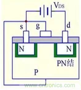 (1) VGS=0時,不管VDS極性如何,其中總有一個PN結(jié)反偏,所以不存在導(dǎo)電溝道。