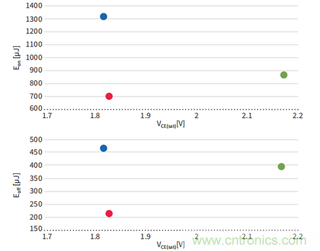 600/650V IGBT 飽和壓降(VCE(sat) ) vs開(kāi)通損耗(Eon ) & 關(guān)斷損耗(Eoff)比較測(cè)試條件: TC = 150°C, IC = 15 A, Rg = 25, VGE = 15 V。