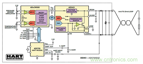 低功耗非常重要,因?yàn)榄h(huán)路供電的所有電路的功耗必須低于3.5 mA。圖 4 顯示了環(huán)路中的 HART 通信應(yīng)用示例。在 AD5700控制板上,AD5700 HART 調(diào)制解調(diào)器與 AD5421 16 位串行輸入環(huán)路供電型 4 mA 至 20 mA DAC 和 ADuCM360 微控制器接口連接,以演示用于測(cè)量壓力(“0”)和溫度(“1”)的兩個(gè)共享數(shù)據(jù)通道的環(huán)路供電型發(fā)射器電路。