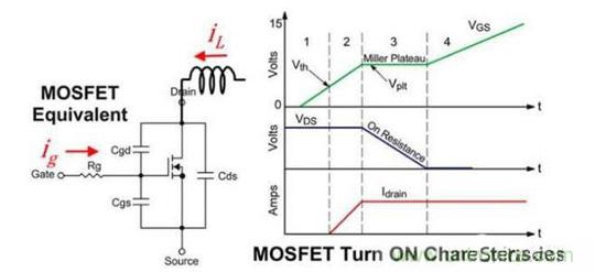 這里就用MOSFET代替BJT了,所以ids = ic,Vds=Vce,Coss也就是Cds代表輸出電容。簡(jiǎn)單來(lái)說(shuō)就是當(dāng)MOS管一開(kāi)始導(dǎo)通時(shí)輸出電容Coss還保持Vds電壓,隨著Ids電流越來(lái)越大,Vds電壓終于保持不住,開(kāi)始下降。直到管子完全開(kāi)啟。比較詳細(xì)的開(kāi)啟過(guò)程是由Miller Plateau造成的,這里借用了網(wǎng)上一些解釋Miller Plateau的圖,如果有不清楚的就請(qǐng)見(jiàn)諒了。