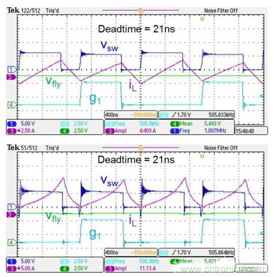 同理對(duì)于Q2開(kāi)啟時(shí),如果電感電流為正,那么當(dāng)我們首先關(guān)閉Q1管時(shí),Vsw就會(huì)被電感電流拉低到0,因?yàn)閕L》0, Q2的Coss會(huì)discharged到0,然后我們?cè)匍_(kāi)啟Q2,就可以達(dá)到ZVS了。這里我有一張其他Topology的PWM converter的波形圖,也和buck工作原理類(lèi)似,大概可以看看基本原理,也就是電感電流為負(fù)時(shí),Q1可以實(shí)現(xiàn)ZVS,讓Vsw的ringing比較小。而當(dāng)電感電流為正時(shí),實(shí)現(xiàn)不了ZVS,Vsw的ringing就比較大了。