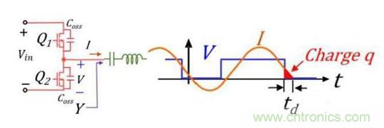 這是因?yàn)槿绻娏鱅是滯后與電壓V的,這樣在Q1開(kāi)啟之前電流I為負(fù)值就會(huì)charge Q2的Coss,同時(shí)discharge Q1的Coss,讓V到Vin,這樣Q1就實(shí)現(xiàn)ZVS turn on了。Q2開(kāi)啟之前,電流I為正,也會(huì)discharge Q2的Coss,和charge Q1的Coss,讓V到0,這樣Q2就實(shí)現(xiàn)ZVS了。