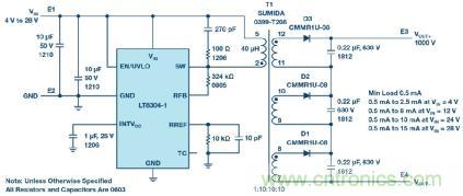 從一個 4 V 至 28 V 輸入產(chǎn)生 1000 V/15 mA 輸出