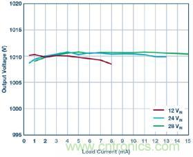 有關 LT8304-1 周圍組件所承受之電壓和電流應力計算的說明,詳見 LT8304-1 的數(shù)據(jù)手冊。值得注意的是,這款 1000 V 解決方案采用了一個在副邊具有 3 個分離輸出繞組的變壓器。原邊至副邊匝數(shù)比為 1:10:10:10,而不是單副邊繞組 1:30 匝數(shù)比變壓器。1:10:10:10 變壓器使得輸出電壓應力可在 3 個高電壓輸出二極管和 3 個高電壓輸出電容器之間分擔。單個組件的電壓額定值只需為總電壓的 1/3,因而有利于獲得更多可供選擇的輸出二極管和輸出電容器。圖 2 顯示這款峰值效率達到 90.5% 的反激式轉(zhuǎn)換器。即使未采用光耦合器,各種不同輸入電壓下的負載調(diào)節(jié)仍然很緊,精度通常為 2% 至 3%,如圖 3 所示。