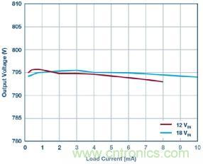 圖 4 顯示一款完整的 4 V~18 V 輸入至 800 V 輸出解決方案,其能夠提供高達 10 mA 的輸出電流。當輸入為 18 V 和負載電流為 10 mA 時,該反激式轉(zhuǎn)換器可實現(xiàn) 88.2% 的峰值效率。圖 5 顯示各種不同輸入電壓下的效率曲線;圖 6 顯示了卓越的負載調(diào)節(jié)性能。另外,該解決方案采用的組件較少。