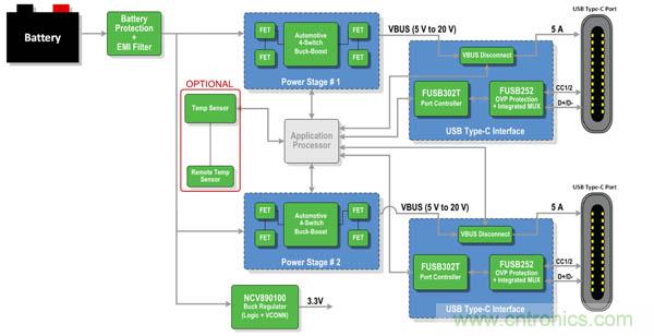 這顯示了控制器和主機處理器之間的I2C接口,說明FUSB302B沒有集成自己的處理器。這是該器件的一個重要特性,因為它無需為一個集成的處理器提供額外功率,同時支持固件駐留在位于系統(tǒng)任意處的處理器中,如果USB規(guī)范被修改,為制造商提供一個更簡單的升級路徑。圖2顯示了一個更詳細的應(yīng)用示例。FUSB302T是FUSB302B的默認源配置選項,可用作在汽車應(yīng)用中實施USB Type-C時構(gòu)成完整系統(tǒng)的一部分。