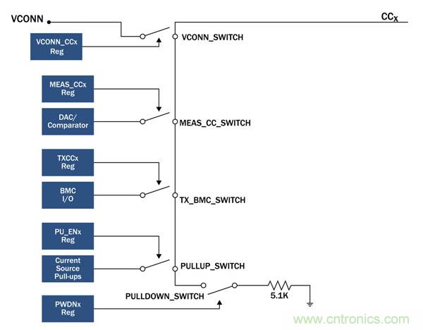 FUSB302B實施了一個CC開關(guān),使它能夠檢測到它是作為設(shè)備主機還是雙角色端口連接,通過多個比較器和由主機處理器上的軟件控制的可編程DAC進行管理(圖3)。