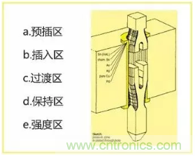 業(yè)界為 Press-fit 端子設(shè)計了各種形態(tài),這些形態(tài)各有優(yōu)缺點(diǎn)。其中,魚眼孔端子是應(yīng)用最為廣泛的 Press-fit 端子結(jié)構(gòu)。通常一個典型魚眼孔端子分 5 個區(qū)域(如上圖所示)。