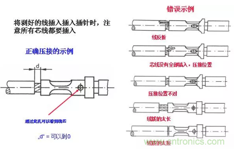 剝線時要保證絕緣皮切割口平滑,線芯完好,線芯上沒有絕緣皮遺留等,錯誤的剝線會讓連接效果大打折扣。正確和錯誤的剝線示意圖如上圖所示。