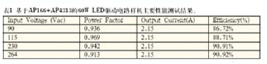 AP1661是一款工作于臨界導(dǎo)通模式下的有源功率因數(shù)校正控制芯片,可廣泛應(yīng)用于開關(guān)電源、LED驅(qū)動(dòng)和電子鎮(zhèn)流器的預(yù)調(diào)整變換器控制。該芯 片內(nèi)部包括1個(gè)啟動(dòng)定時(shí)器可滿足待機(jī)應(yīng)用要求,1個(gè)能實(shí)現(xiàn)接近于1的功率因數(shù)的單象限乘法器和1個(gè)零電流檢測(cè)模塊確保臨界斷續(xù)方式工作。AP1661的圖 騰柱驅(qū)動(dòng)輸出能夠?yàn)橥獠縈OSFET或IGBT提供最大600mA驅(qū)動(dòng)電流和800mA關(guān)斷電流能力。采用了先進(jìn)的雙極型互補(bǔ)金屬氧化物半導(dǎo)體設(shè)計(jì)和制造 工藝,具有低啟動(dòng)電流,低工作電流和低功耗的特點(diǎn)。AP1661同時(shí)具有完善的保護(hù)功能,包括過(guò)壓保護(hù)、帶有滯后的輸入欠壓鎖定和乘法器輸出嵌位以限制開 關(guān)最大峰值電流。圖7為該方案60W應(yīng)用電路樣機(jī)實(shí)物照片。圖8為應(yīng)用該方案LED直管燈實(shí)物照片。