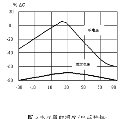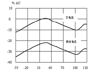 從圖中可以看到,COG電容器的容量幾乎隨溫度沒有變化,X7R電容器的容量在額定工作溫度范圍變化12%以下,Y5V電容器的容量在額定工作溫度范圍內(nèi)變化70%以上。這些特性是必須注意的,否則會出現(xiàn)濾波器在高溫或低溫時(shí)性能變化而導(dǎo)致設(shè)備產(chǎn)生電磁兼容問題。