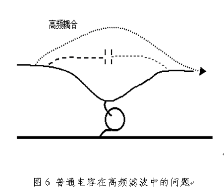 在實(shí)際工程中,要濾除的電磁噪聲頻率往往高達(dá)數(shù)百M(fèi)Hz,甚至超過1GHz。對這樣高頻的電磁噪聲必須使用穿心電容才能有效地濾除。普通電容之所以不能有效地濾除高頻噪聲,是因?yàn)閮蓚€(gè)原因,一個(gè)原因是電容引線電感造成電容諧振,對高頻信號呈現(xiàn)較大的阻抗,削弱了對高頻信號的旁路作用;另一個(gè)原因是導(dǎo)線之間的寄生電容使高頻信號發(fā)生耦合,降低了濾波效果,如圖5所示。